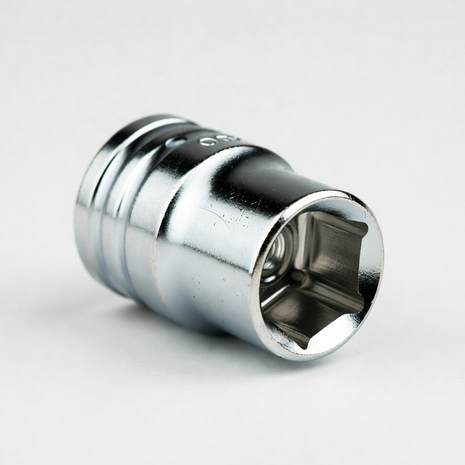 A metal socket tool is placed on a white surface. It has a shiny finish and a hexagonal opening.