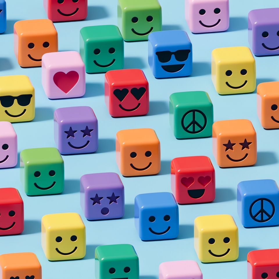 Small cubes with various faces sit on a blue surface. The cubes include smiley faces and other expressions, arranged in neat rows.