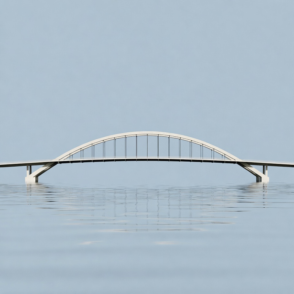 A bridge stands over still water, reflecting the clear sky. It connects land on both sides. The scene shows a simple structure and calm surroundings.