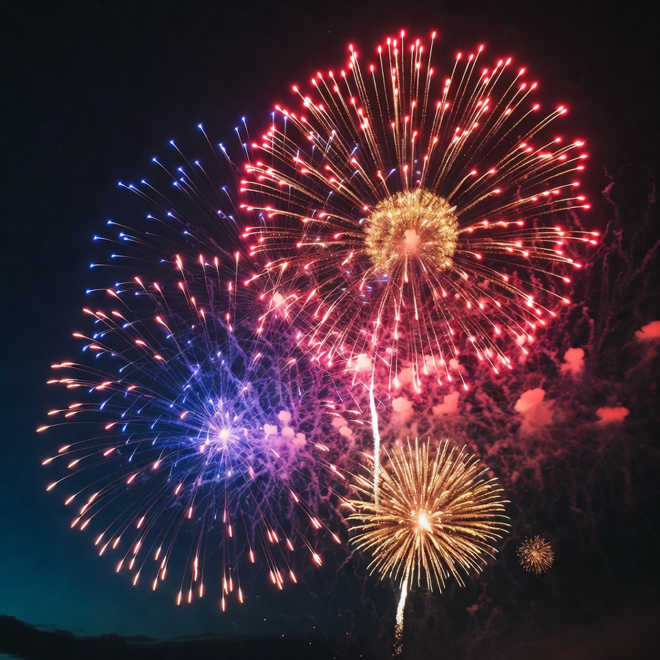 Fireworks light up the night sky during a celebration. Colorful bursts of red, blue, and gold create a festive atmosphere.