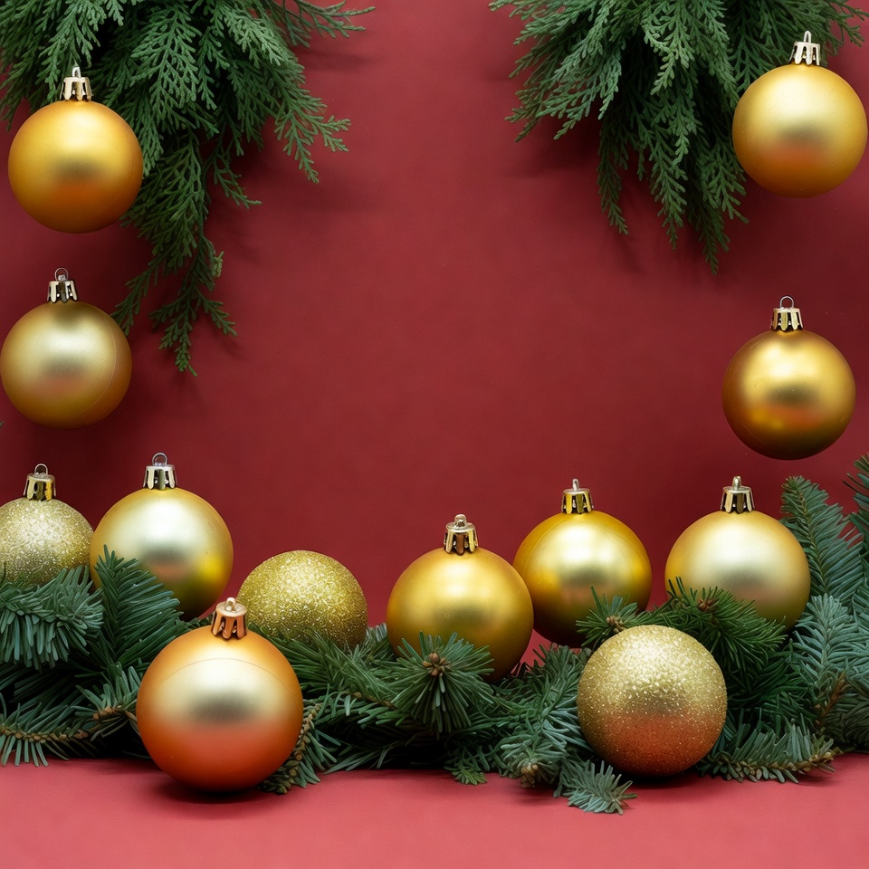 Golden ornaments and evergreen branches create a festive scene for Christmas celebrations and holiday decorations in winter.