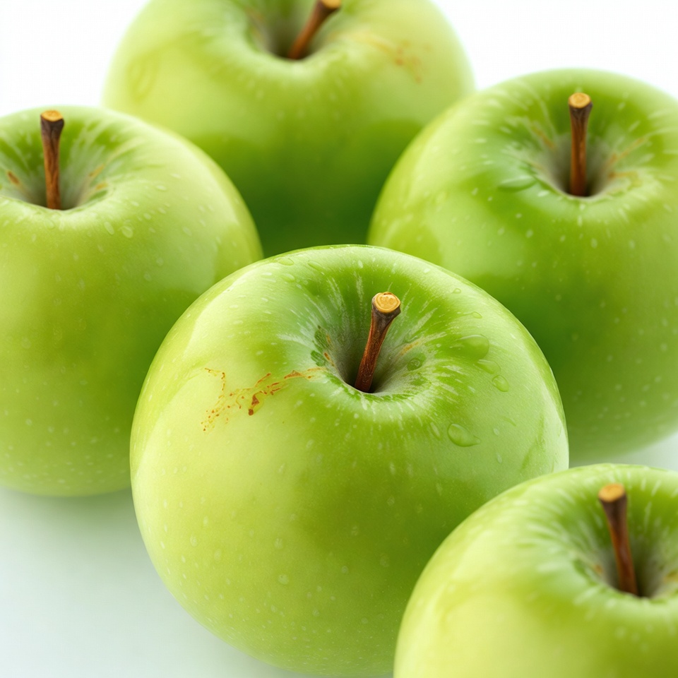 Five green apples sit close together on a white surface, showcasing their smooth skin and stems. Light reflects off their surface.