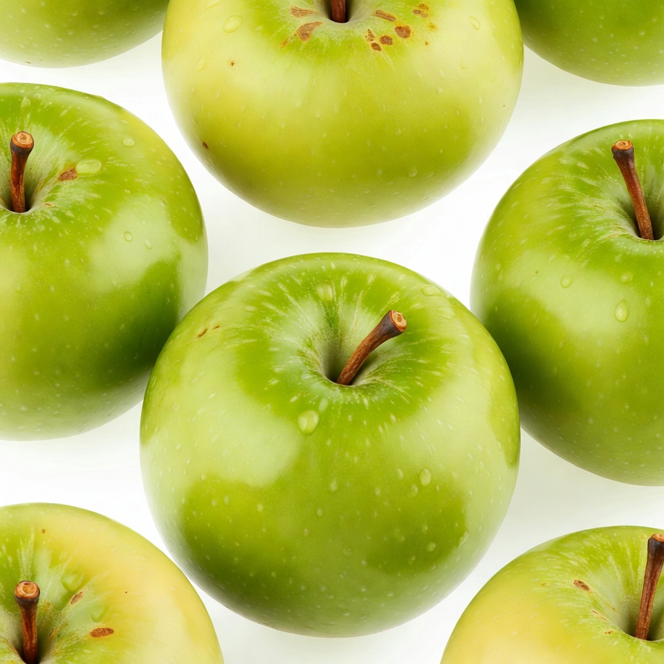 Several green apples are arranged closely on a white surface. They show smooth skin and stems, creating a simple visual pattern.
