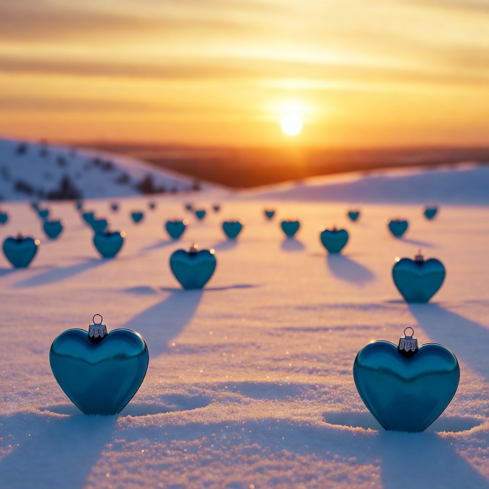 Blue heart ornaments are placed in the snow as the sun sets in the background. The scene shows many hearts against a snowy landscape.