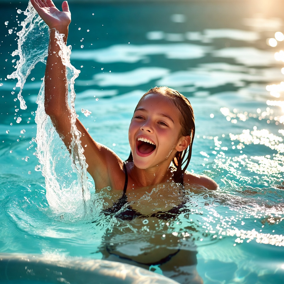 A girl smiles and raises her hand while splashing water in a swimming pool during the afternoon sunshine.