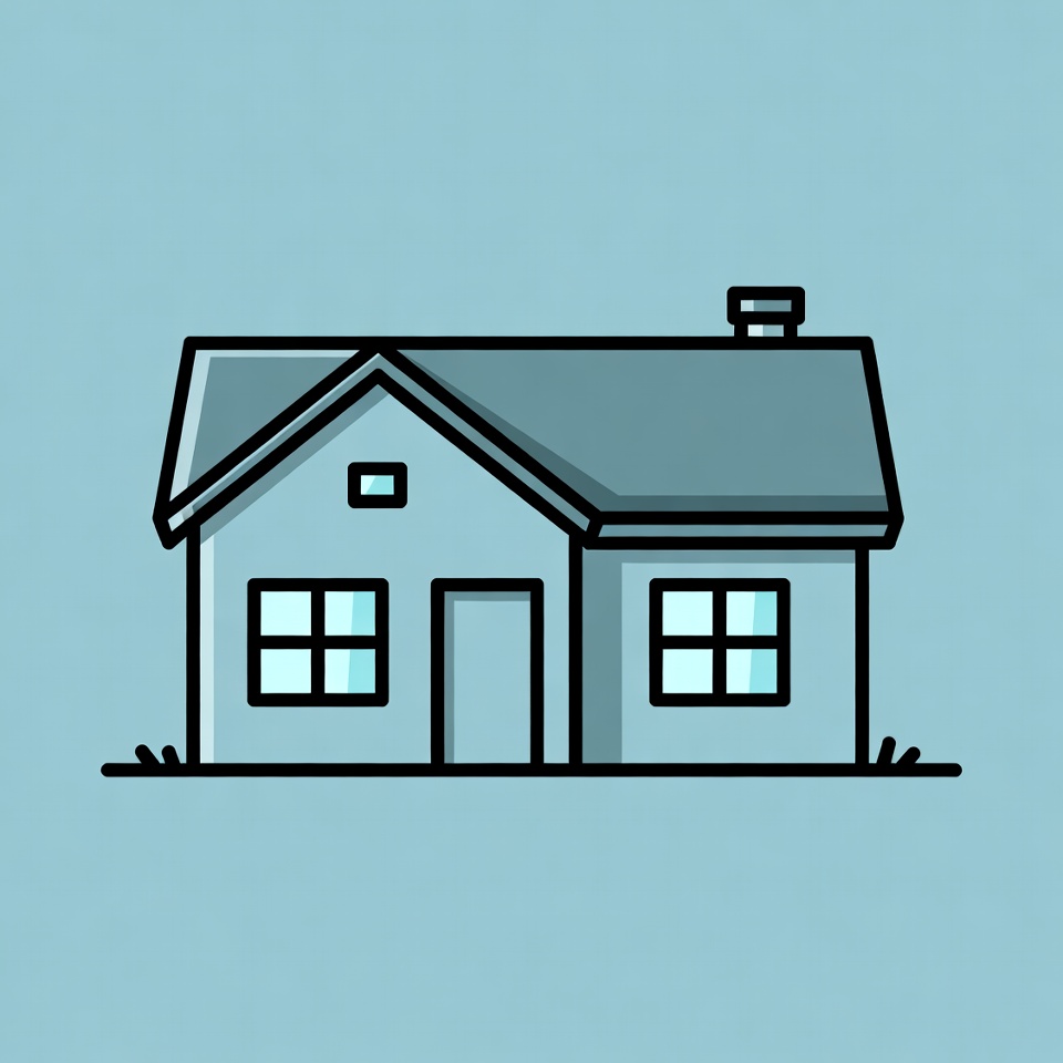 A drawing of a house with a chimney and windows sits on a light blue background. The design is clean and straightforward with outlined details.