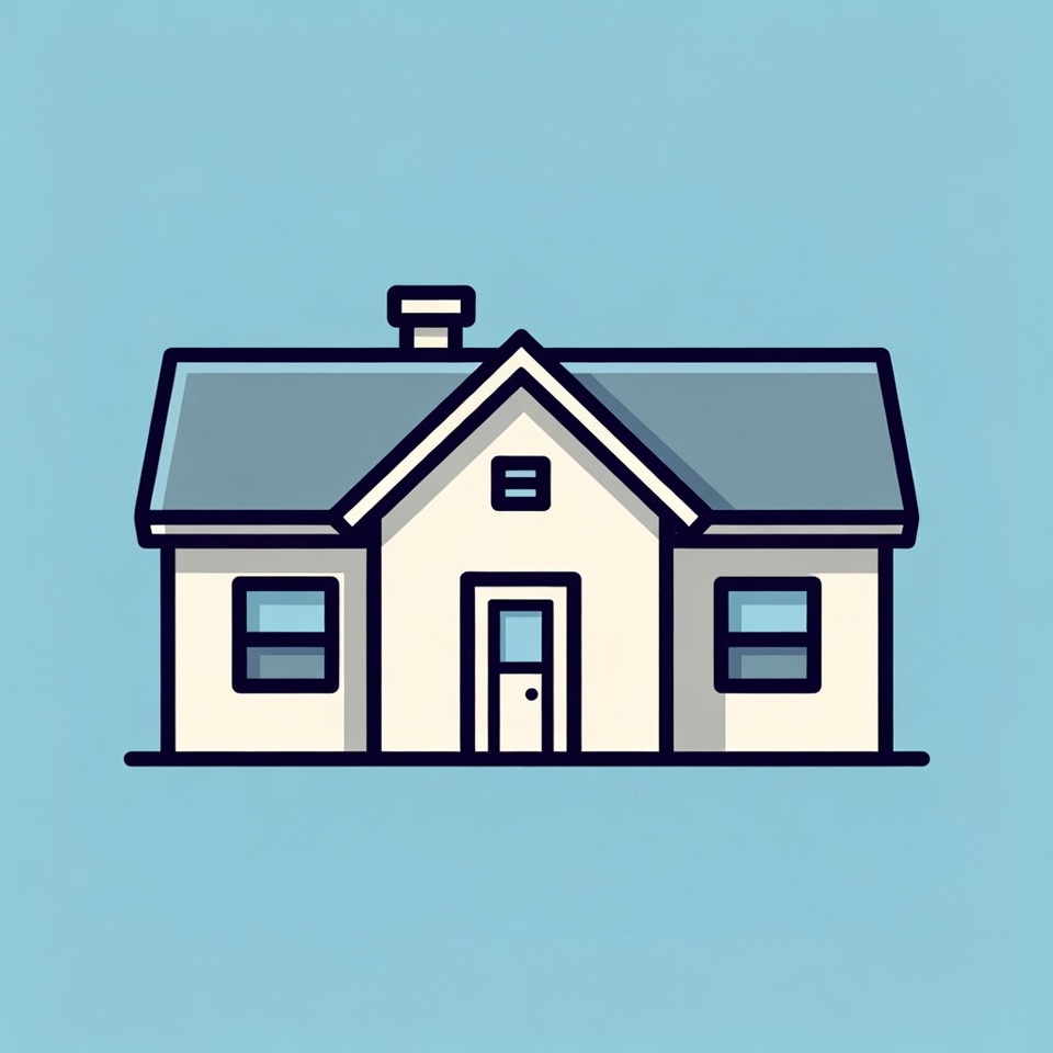 A drawing of a house with a sloped roof and a front door. The house has windows and is set against a blue background.