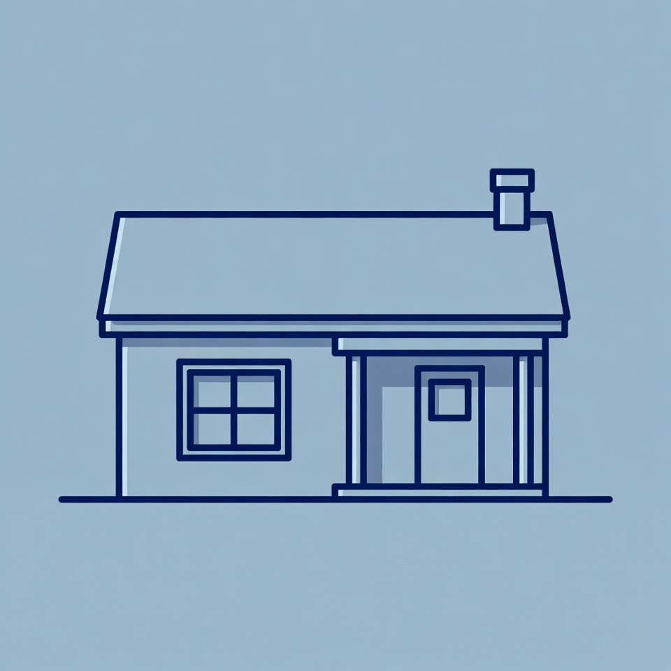 A house with a chimney and front porch is drawn in blue lines on a light blue background. The design shows windows and a door.
