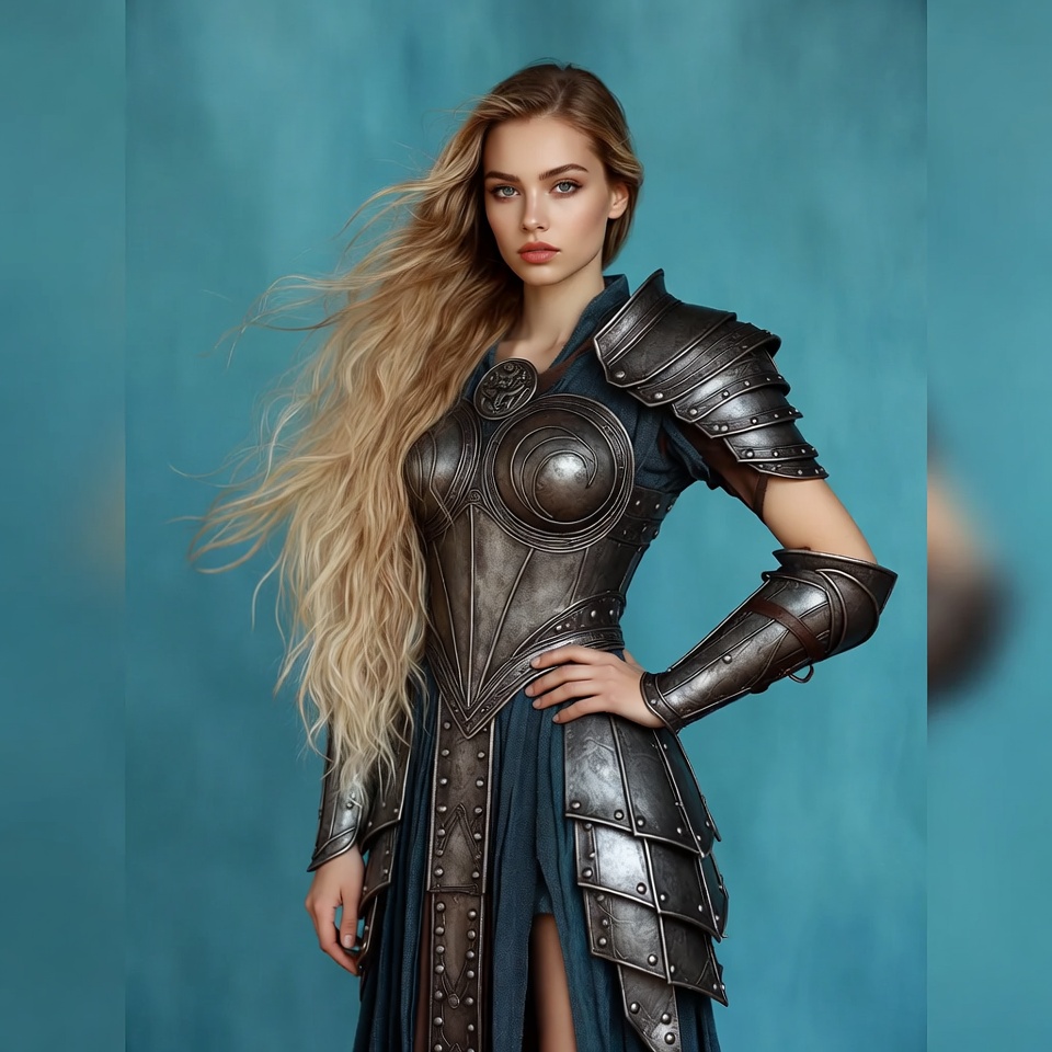 armor, background, blue, character, confident, costume, creativity, design, fantasy, fashion, female, long hair, metal, pose, shoot, standing, strength, stylist, warrior, woman