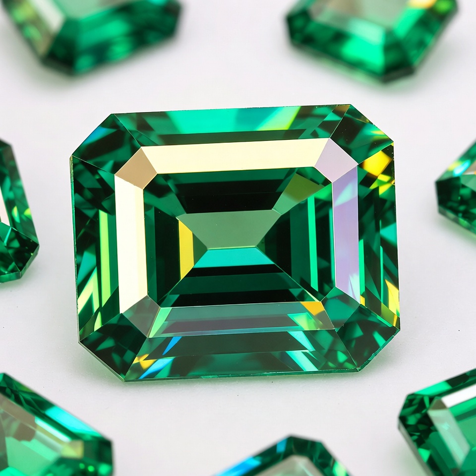 A group of bright green gemstones are arranged on a white surface. Each stone reflects light in a unique way.