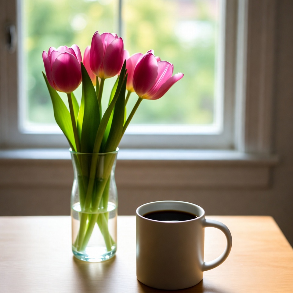 A cluster of pink tulips in a vase sits next to a mug of coffee on a table. The window lets in natural light.