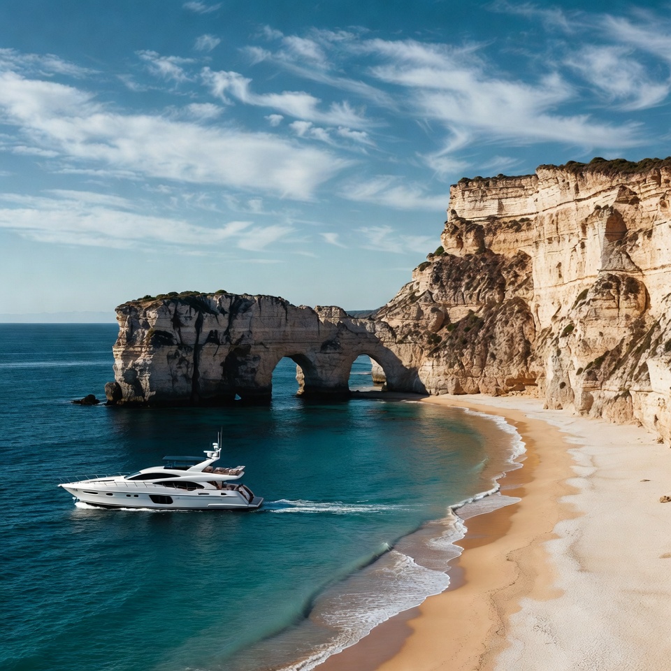 beach, boat, coast, horizon, island, landscape, marine, natural arch, ocean, outdoor, rock formations, sand, sea, shoreline, summer, tourism, travel, water, waves, yacht