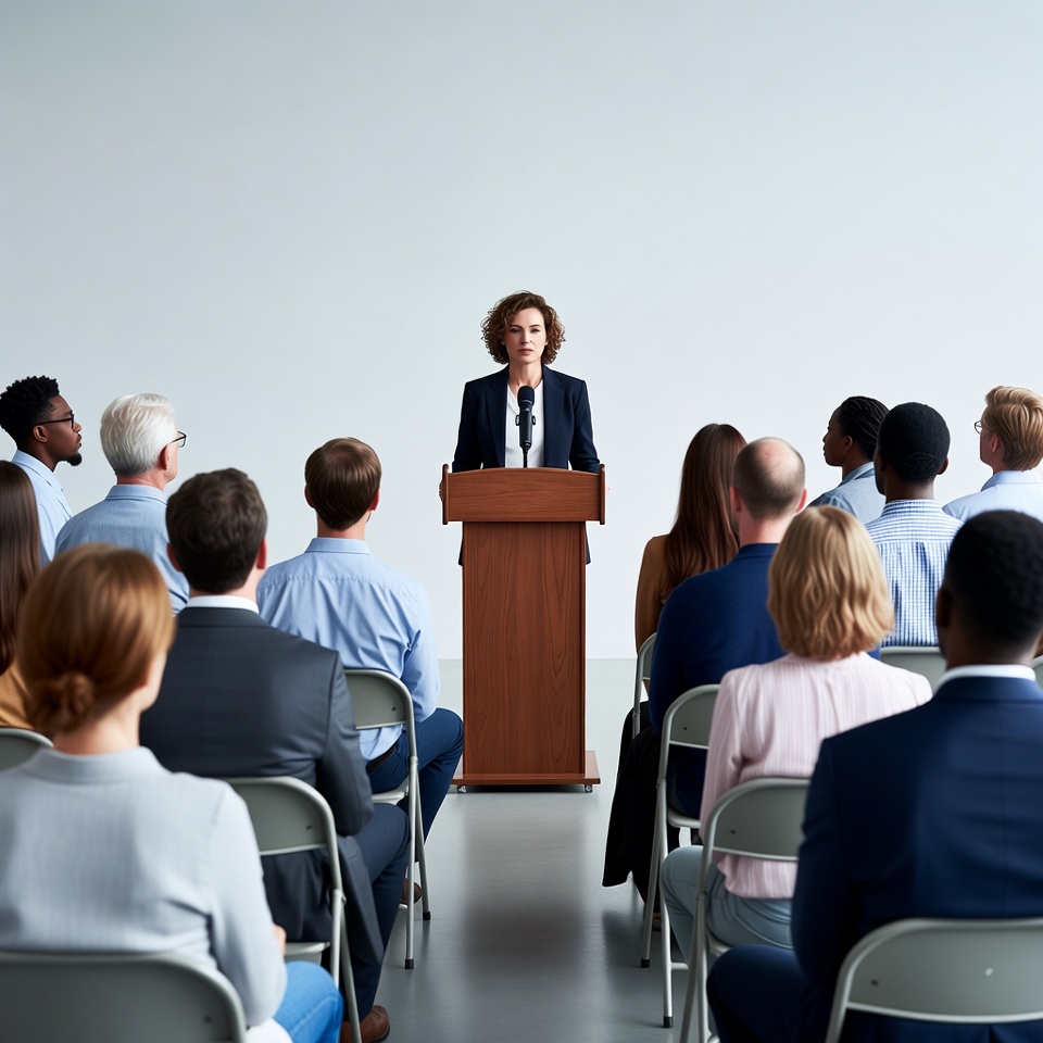 A person stands at a podium speaking to a group of people seated in chairs inside a hall. It seems to be a formal event or meeting.