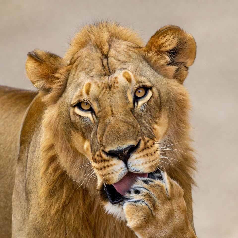 A lion is grooming its paw while sitting on the ground. The scene shows details of the lion's face and fur against a plain background.