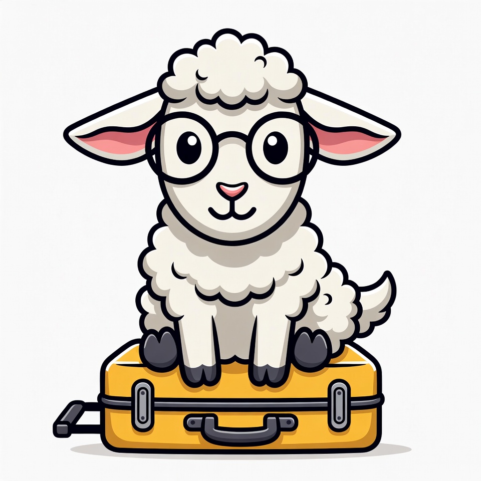 adventure, animal, cartoon, character, cute, fun, glasses, illustration, luggage, outdoor, pet, playful, sheep, smiling, suitcase, travel, travel gear, whimsical, wool, yellow