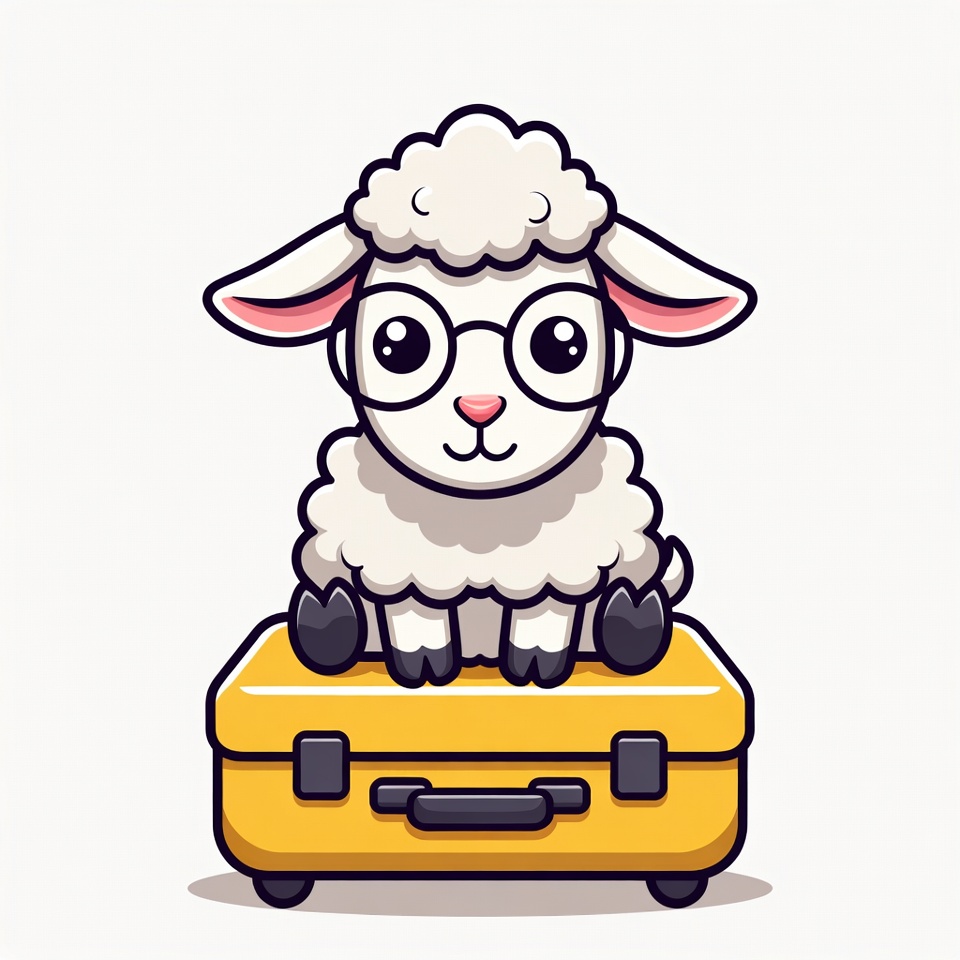 A cartoon sheep wearing glasses sits on a yellow suitcase. The scene suggests travel and adventure for the sheep.