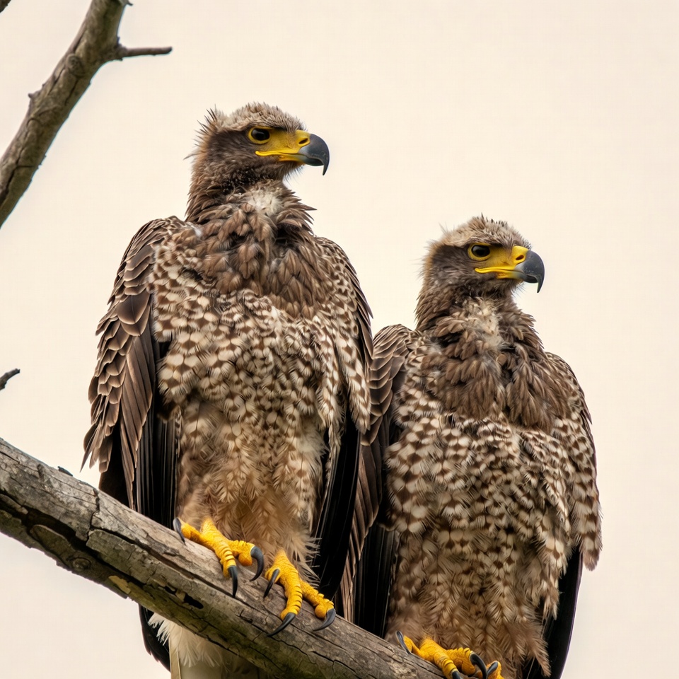 animal behavior, avian, birds, branch, colorful beak, eagles, feathers, habitat, natural setting, nature, observation, outdoor, perched, predators, raptors, serene environment, sky, tree, two birds, wildlife