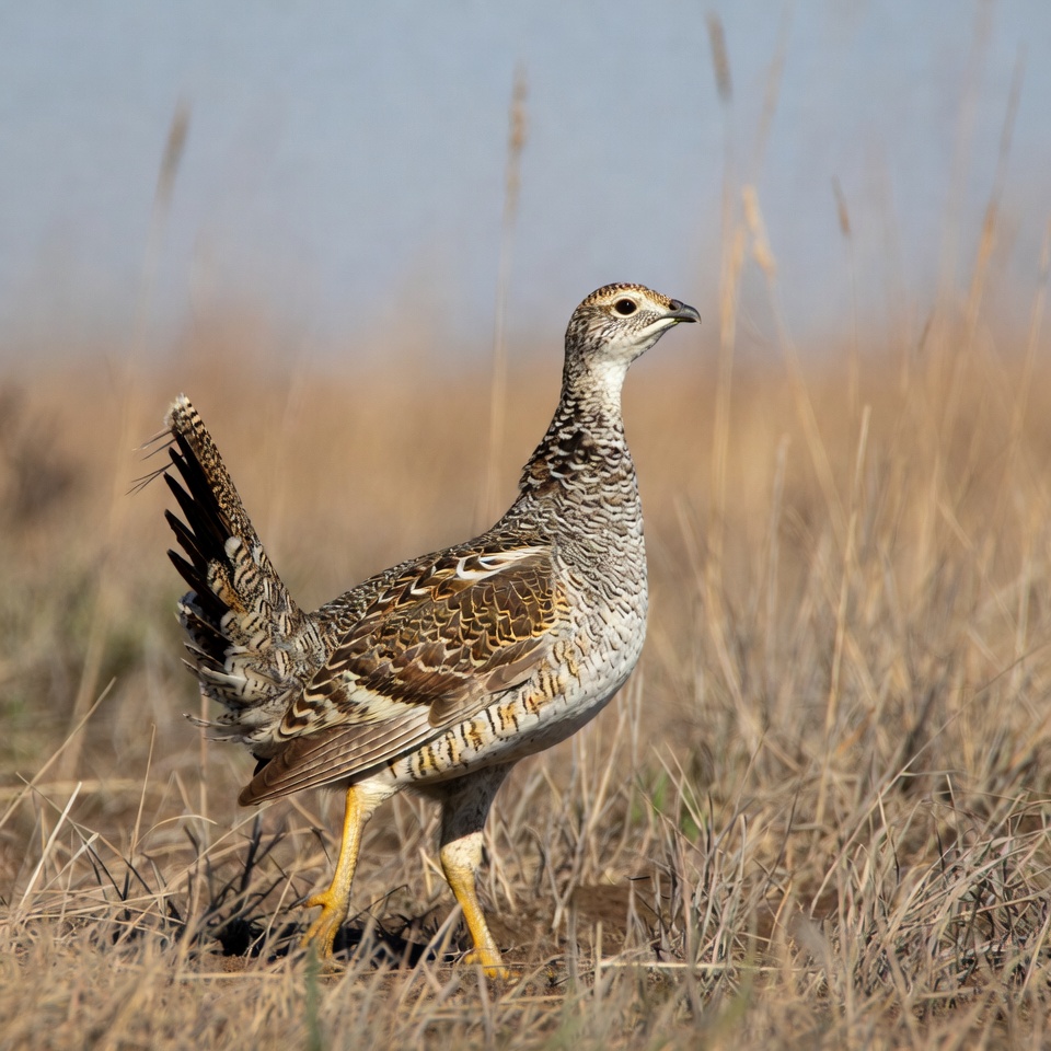 animal, bird, day, dry, environment, feathers, grass, ground bird, habitat, landscape, movement, nature, open field, outdoors, pattern, species, sunlight, tall grass, walking, wildlife