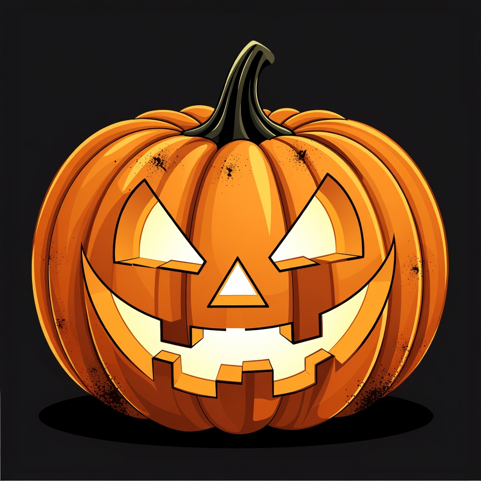 A pumpkin with a carved face is seen against a black background. The face has a mischievous smile and sharp eyes, typical for Halloween.