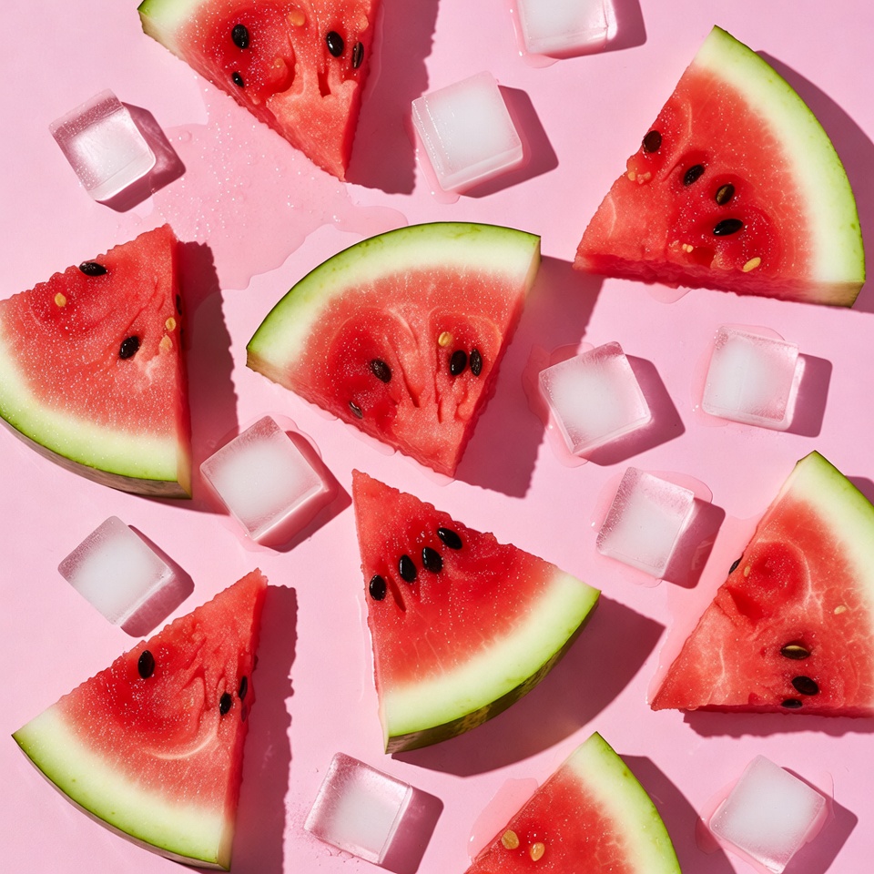 Watermelon slices are arranged on a pink surface with ice cubes scattered around them. The scene shows a fresh summer snack.