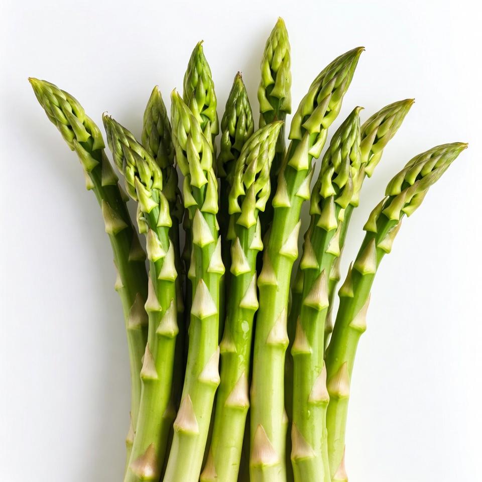 Several fresh green asparagus stalks stand upright on a white background. The tips are vibrant and the stalks are straight and tall.