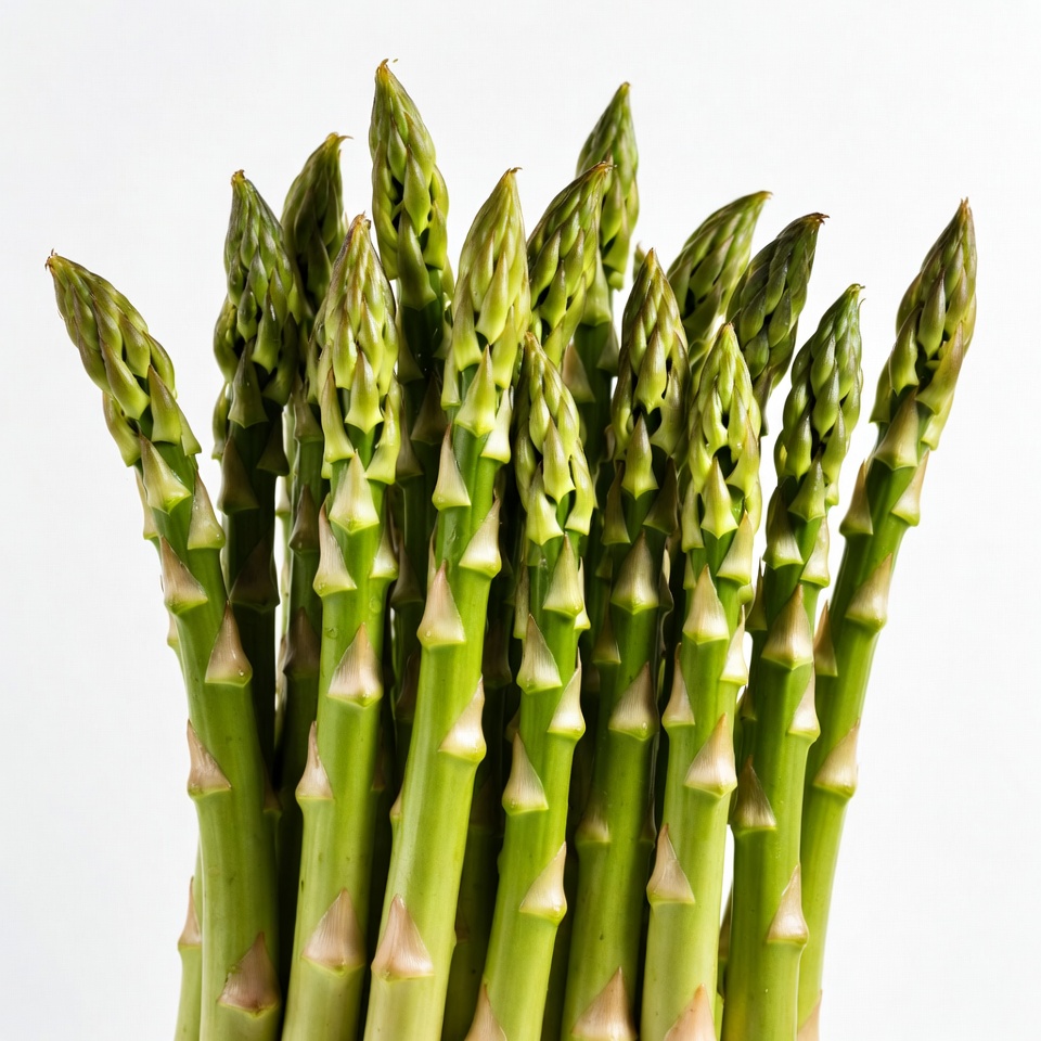 Green asparagus spears are gathered together. They have a bright appearance and are prepared for cooking or serving.