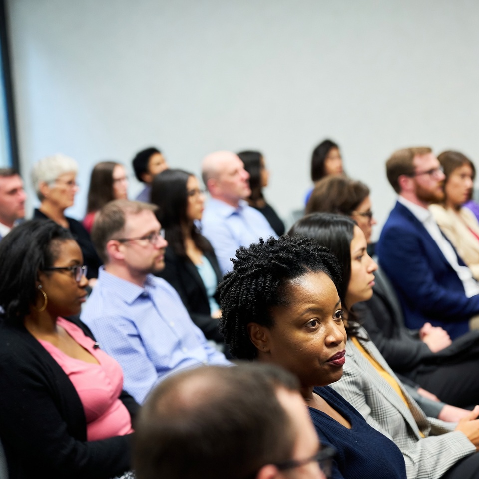 People gather in a conference room for a community discussion. Participants listen and engage with one another during the event.