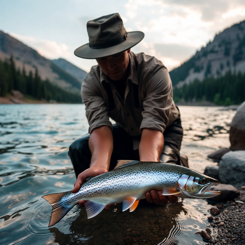 A man stands by a river holding a large trout with mountains in the background. It is late afternoon with soft light reflecting on the water.