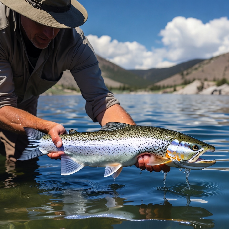 activity, angling, catch, fish, fishing, hand, hobby, lake, mountains, nature, outdoors, person, recreation, season, sport, summer, sunlight, trout, water, wilderness