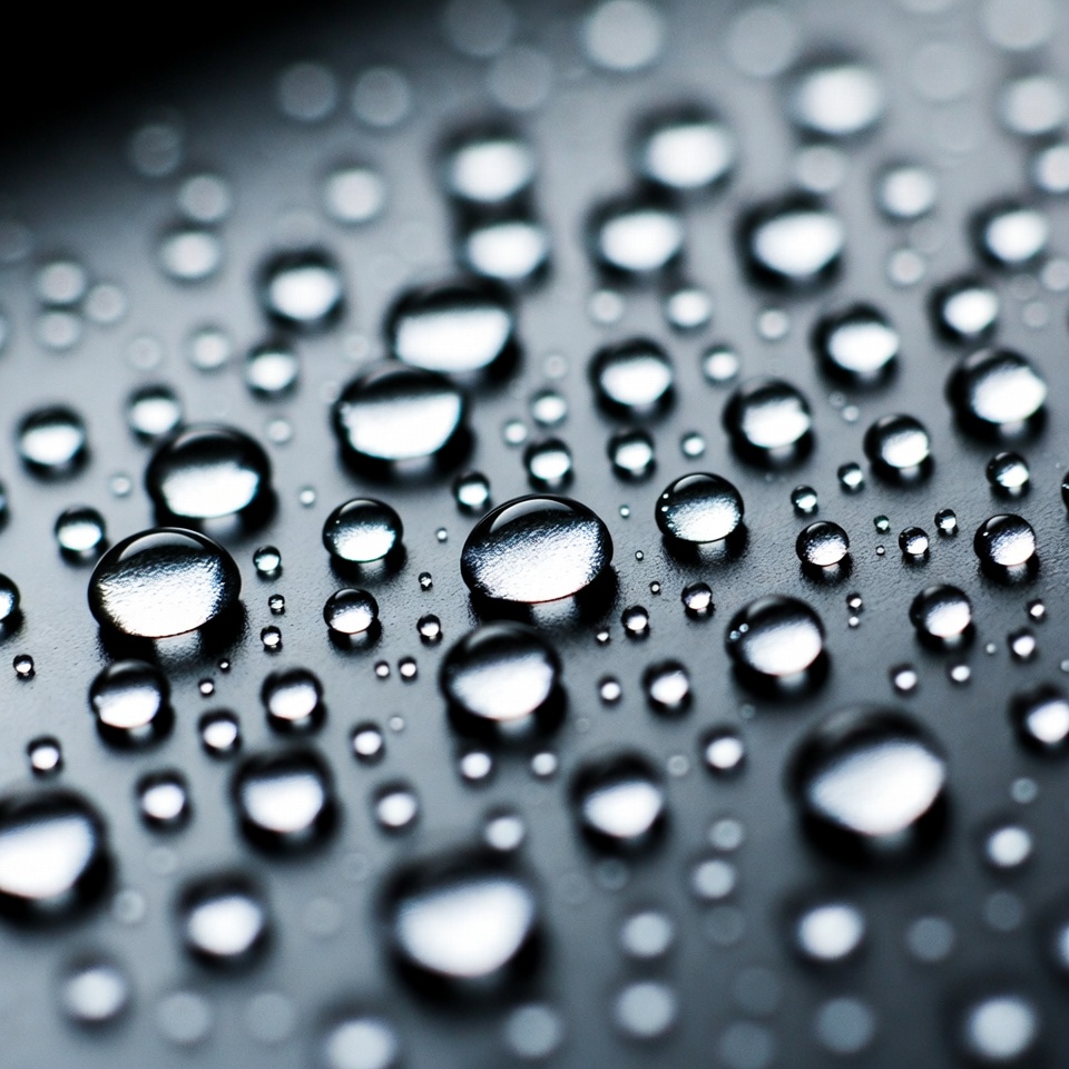 Water droplets collect on a smooth surface, reflecting light on a dark background. The scene shows detail in the drops and their arrangement.