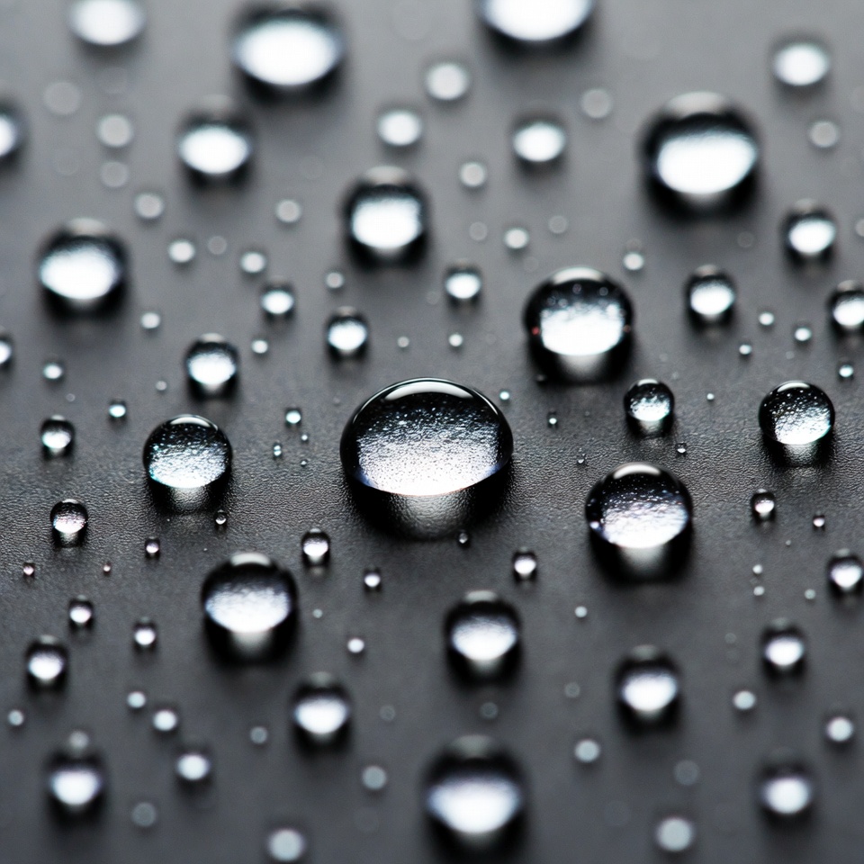 Water droplets gather on a flat black surface. The light reflects off the droplets, creating a pattern on the dark background.