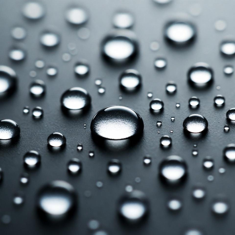 Small water droplets gather on a black surface, showing different sizes and shapes. Some droplets are clear while others reflect light.