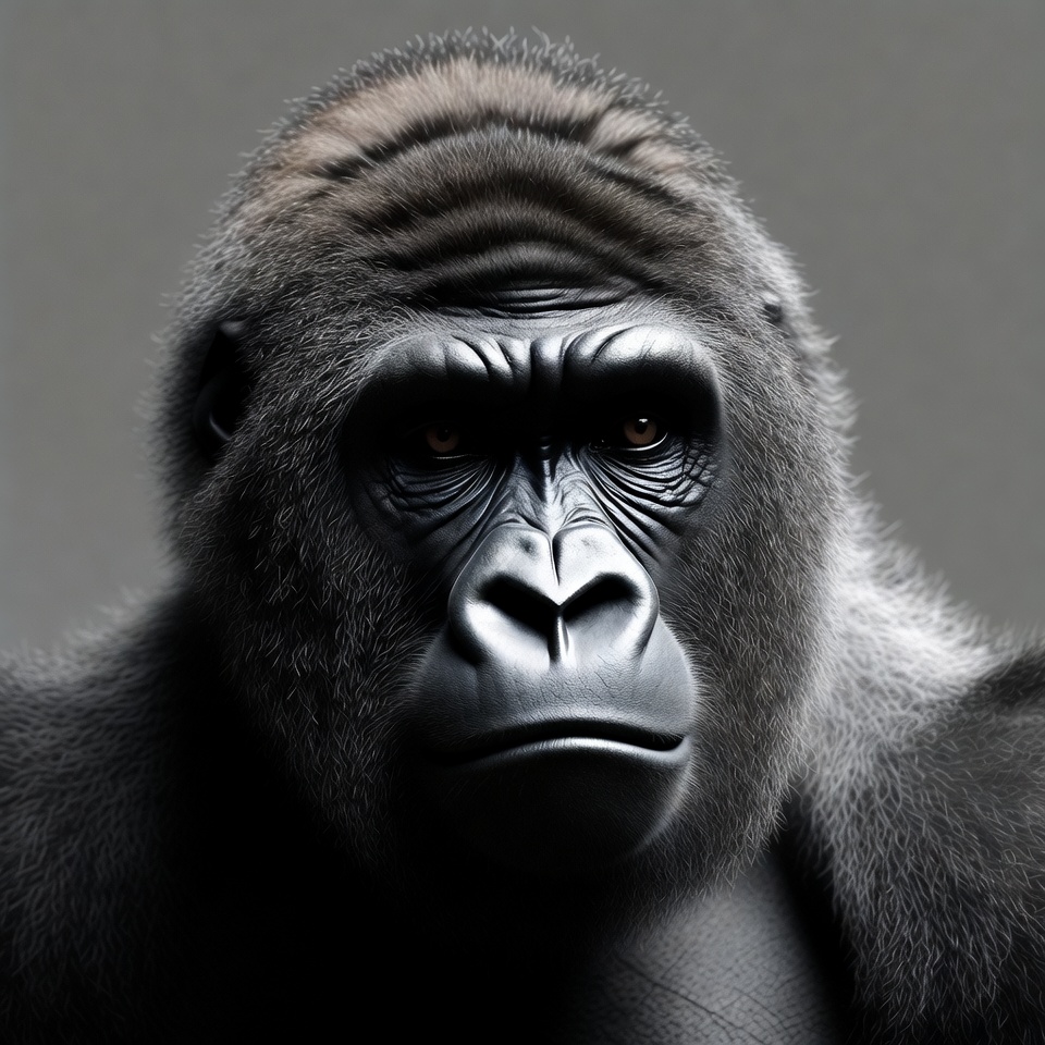 Gorilla looks directly at the camera with a serious expression. The background is plain, emphasizing the gorilla's features and fur details.