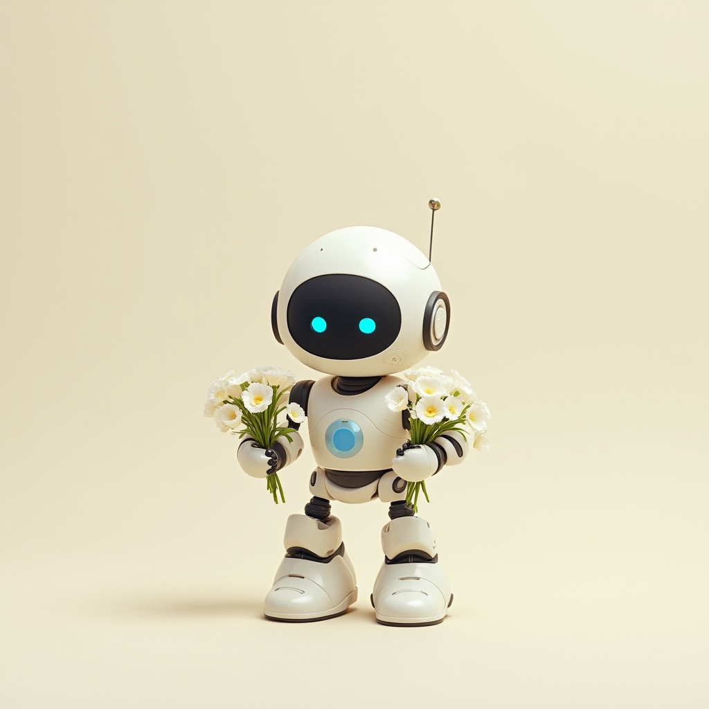 A robot stands in a studio holding two bouquets of flowers. It has a friendly appearance with glowing blue eyes and a simple design.