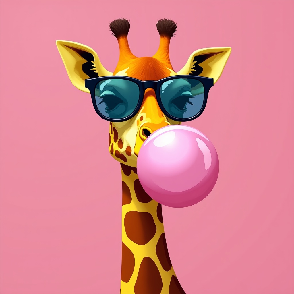 A giraffe wearing sunglasses blows a large bubble with pink gum. The background is a solid pink color, making the scene vibrant.