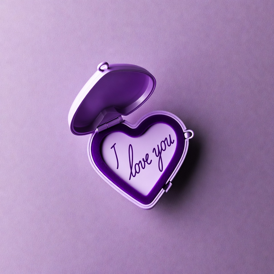 A heart-shaped box opens to reveal a message that expresses love. The box is purple and set on a matching background.