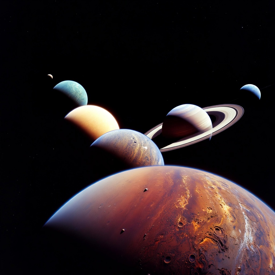 Several planets align in outer space, showing different colors and textures. The scene captures elements of the solar system clearly and distinctly.