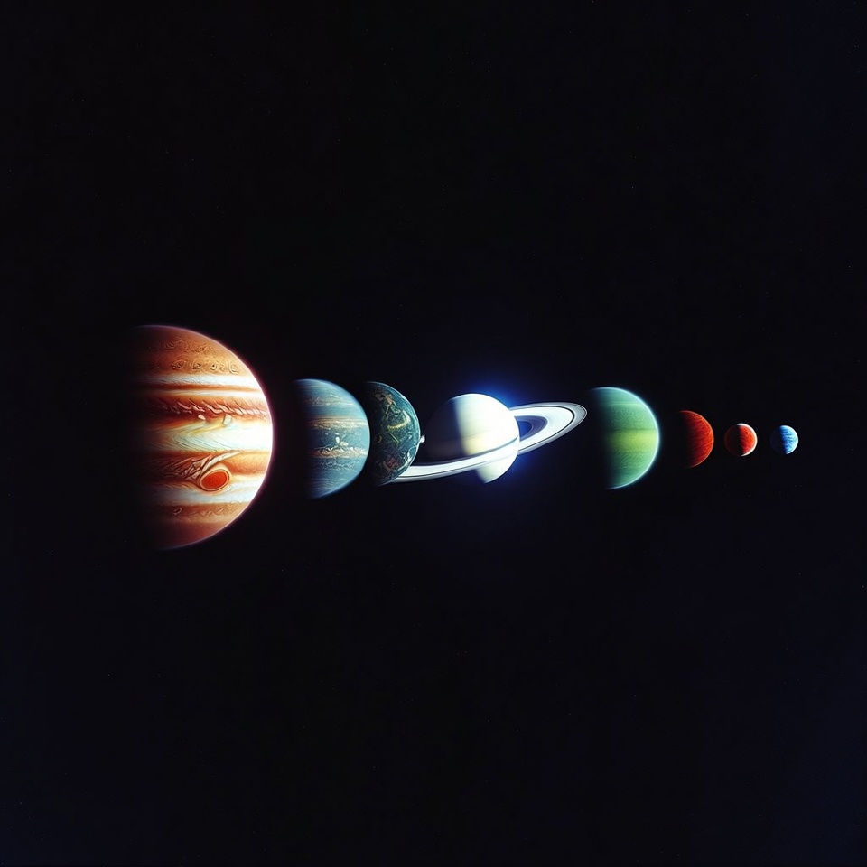 Eight planets from the solar system are arranged in a straight line. The background is dark, highlighting each planet’s features.