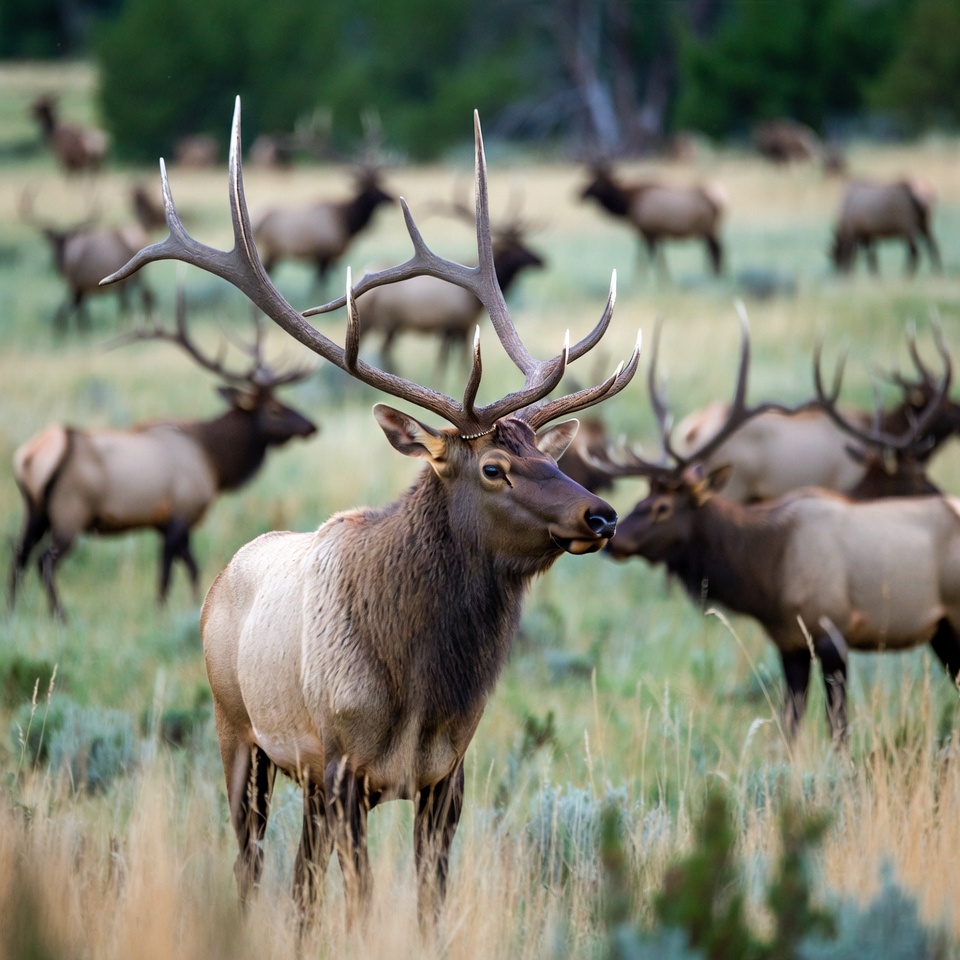 A group of elk grazes in a grassy area under clear skies during daylight hours. One elk stands in front, showcasing its antlers.