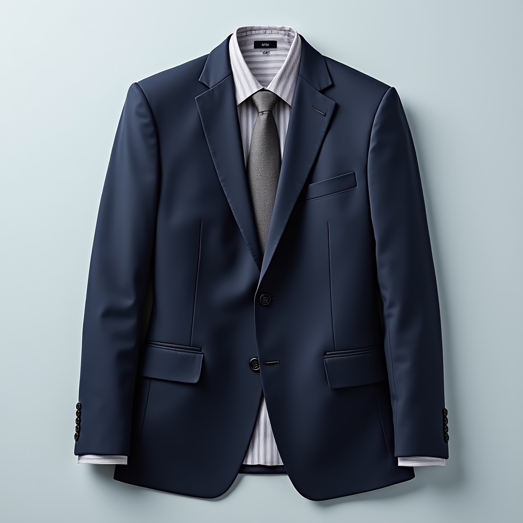 A dark suit hangs against a gray wall. A white and gray striped shirt and tie are worn under the suit jacket. This setup shows formal attire.