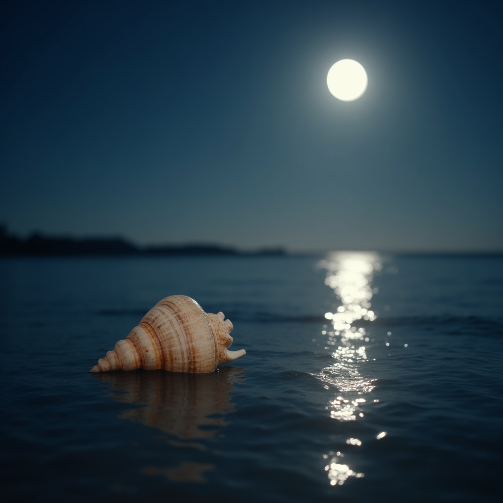 A shell rests on the water's surface at night. The moon reflects off the calm sea. The scene shows the beauty of nature and nighttime.
