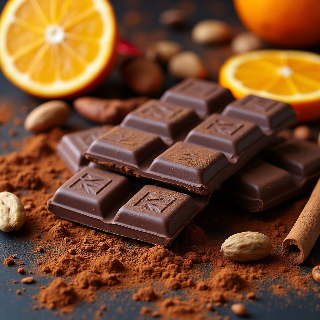 Chocolate pieces rest on cocoa powder amid sliced oranges, nuts, and cinnamon sticks. A scene of food ingredients and flavors.