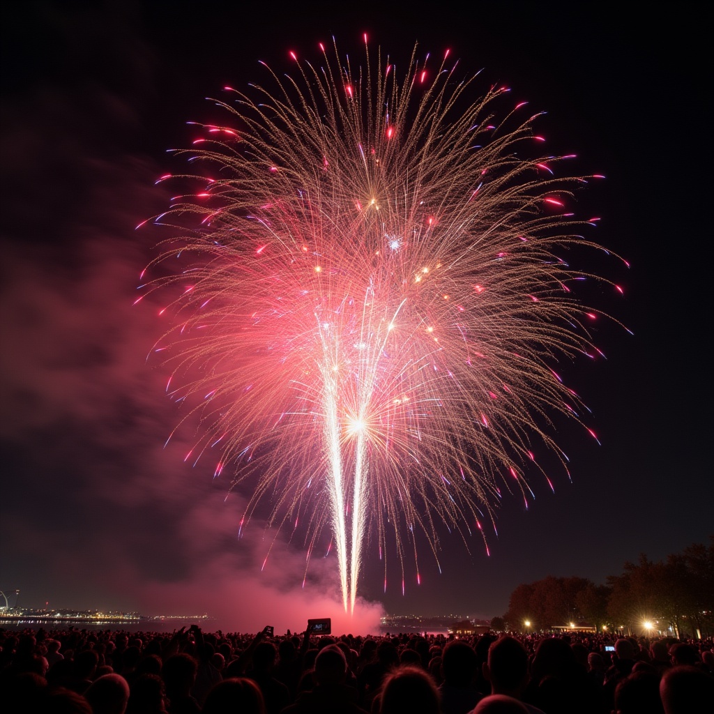 atmosphere, bright, bursts, celebration, colors, crowd, event, excitement, explosion, festive, fireworks, gathering, location, night, people, show, sky, spectators, summer, waterfront
