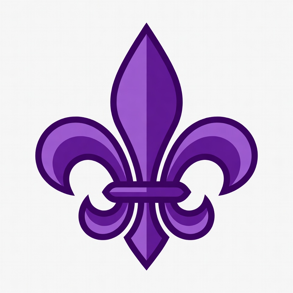 A purple fleur-de-lis motif on a white background. This symbol has roots in French culture and is commonly used in heraldry.