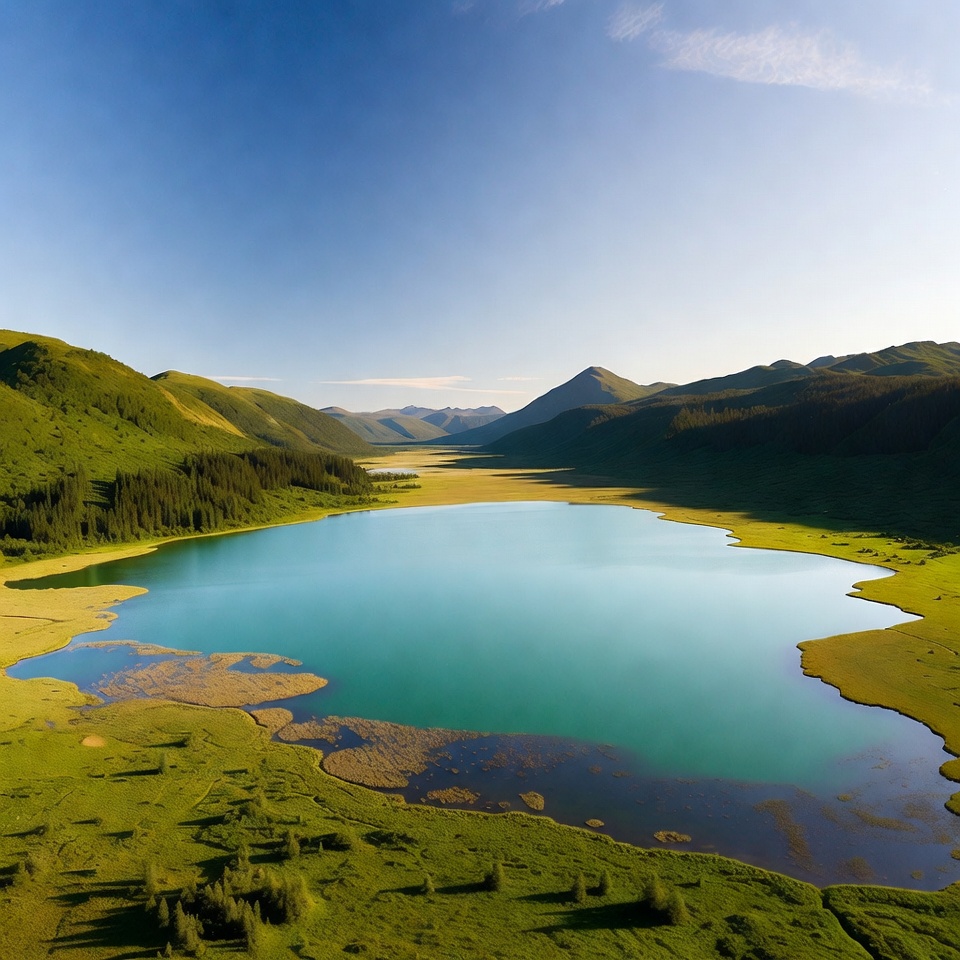 Green hills surround a large blue lake at sunset. Sky reflects on the water. Birds fly over the lake as trees stand in the background.