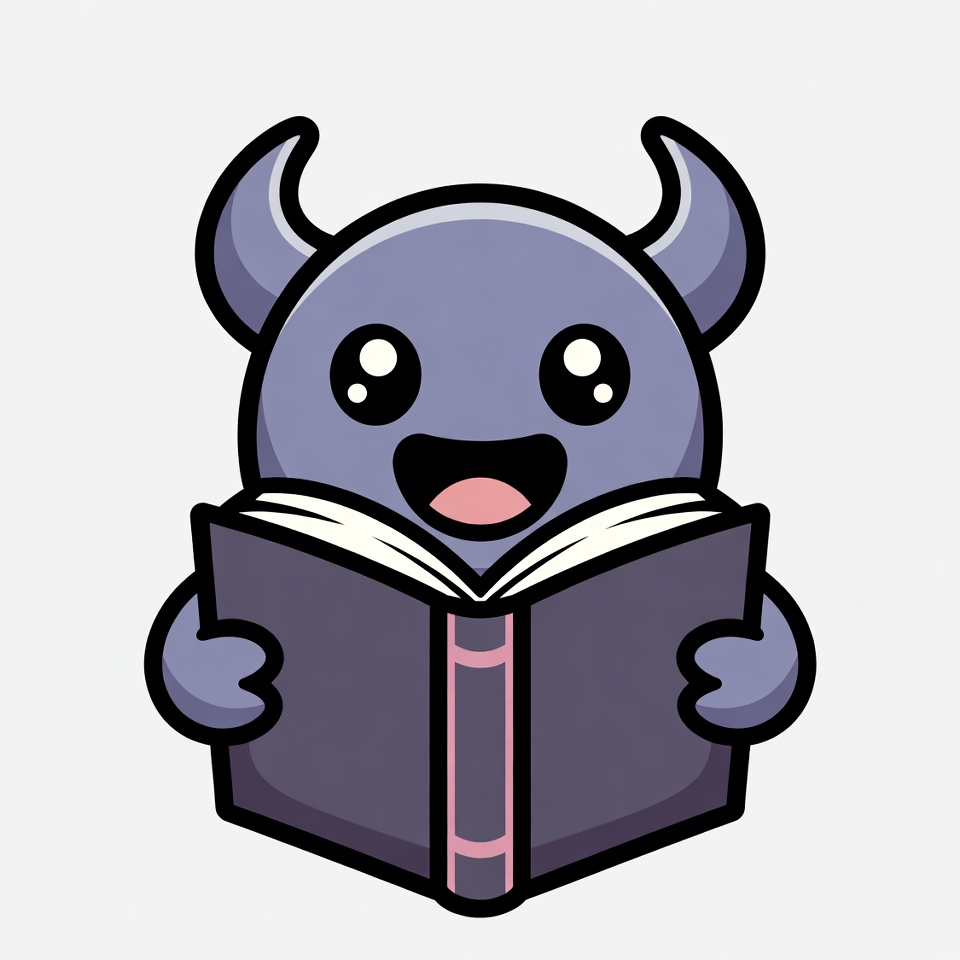 animation, art, book, cartoon, character, creature, cute, design, fantasy, fun, happy, horns, illustration, imaginative, joy, knowledge, playful, reading, smile, stories