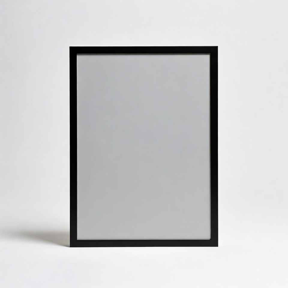 A black-framed mirror stands upright against a plain background in a well-lit space. It reflects light and surroundings.