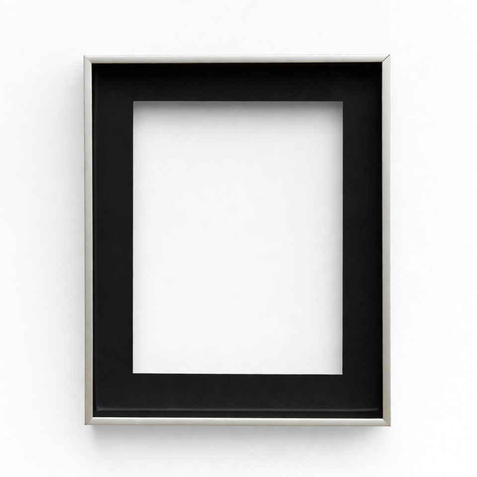 A black and silver frame is displayed on a white wall. The frame is blank and ready for artwork or a picture.