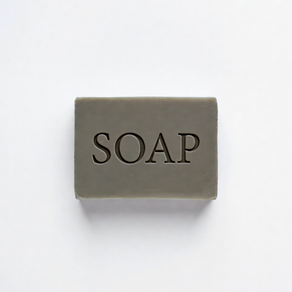 A bar of gray soap is placed on a light surface. The word 'SOAP' is embossed on the top of the bar.