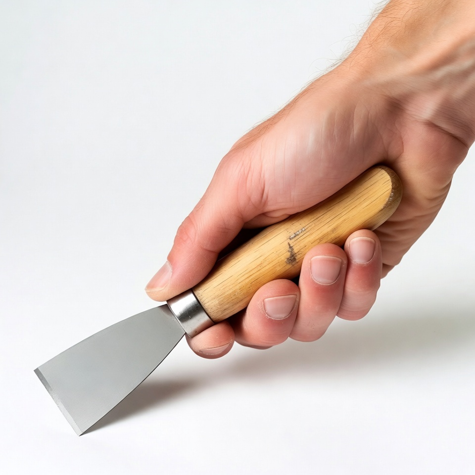A hand grips a metal tool with a wooden handle. The tool is used for scraping or shaping materials in crafting activities.